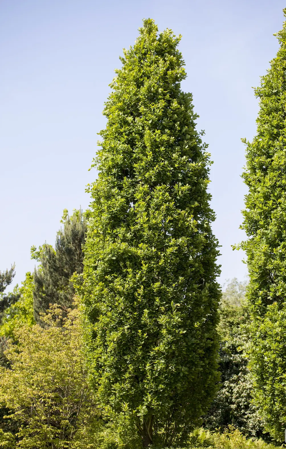 An upright form of the oak, reaching heights of 20m but only around 3m wide. Dark green deeply lobed leaves turning golden brown in the autumn, which will stay on the tree well into winter in a sheltered position. Acorns are produced late summer and make a nice addition for the wildlife in the autumn.