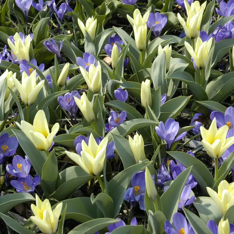 Stunning white tulip with a yellow base (pictured here with crocuses) that flowers in April.